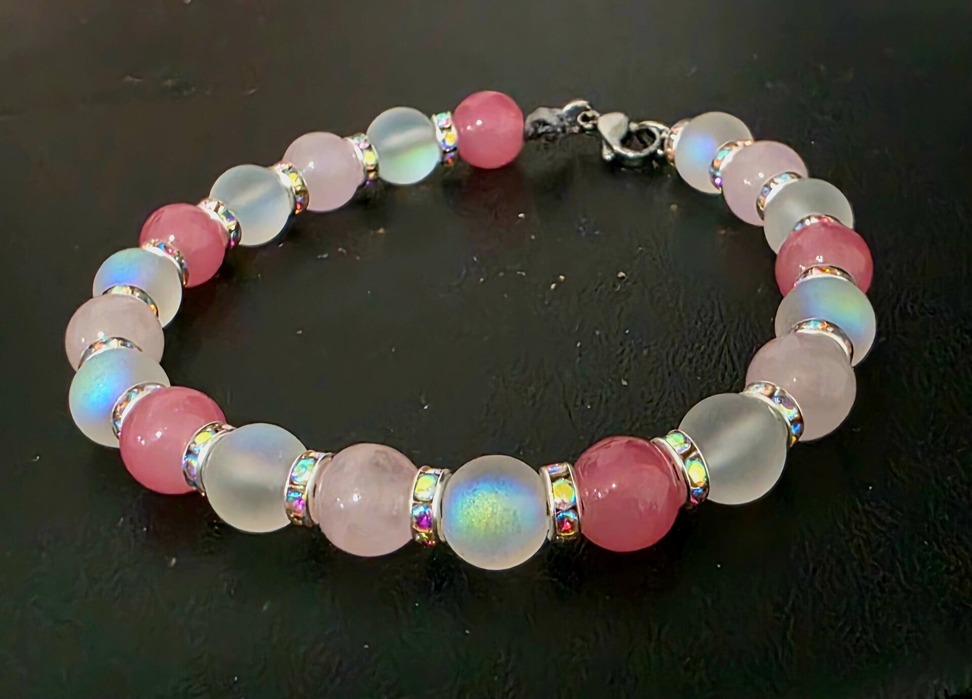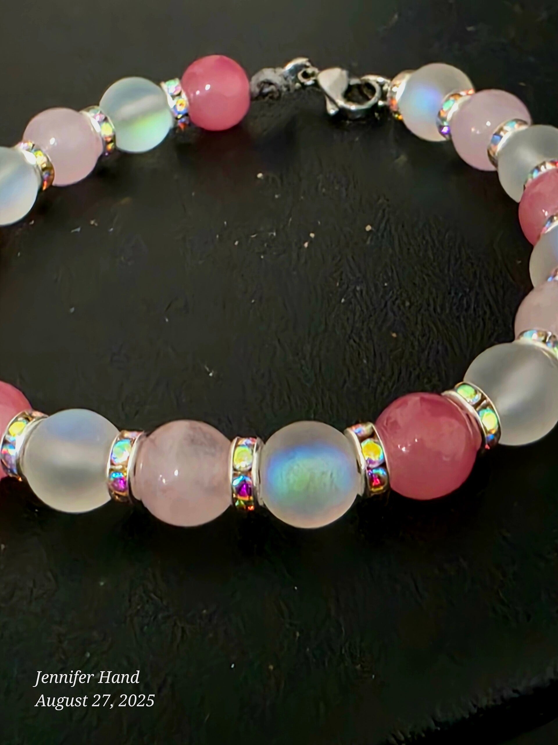 Beautiful handcrafted rose quartz and moonstone bracelet on durable hemp cord with a stainless steel lobster clasp. Sized to fit the average size wrist, it is approximately 7 inches in length containing 20 8mm gemstone & glass beads , plus rondell spacers. Manifest love and intuition with this beautiful addition to any ensemble. Great gift for yourself or a loved one. Order today & Pick Up today