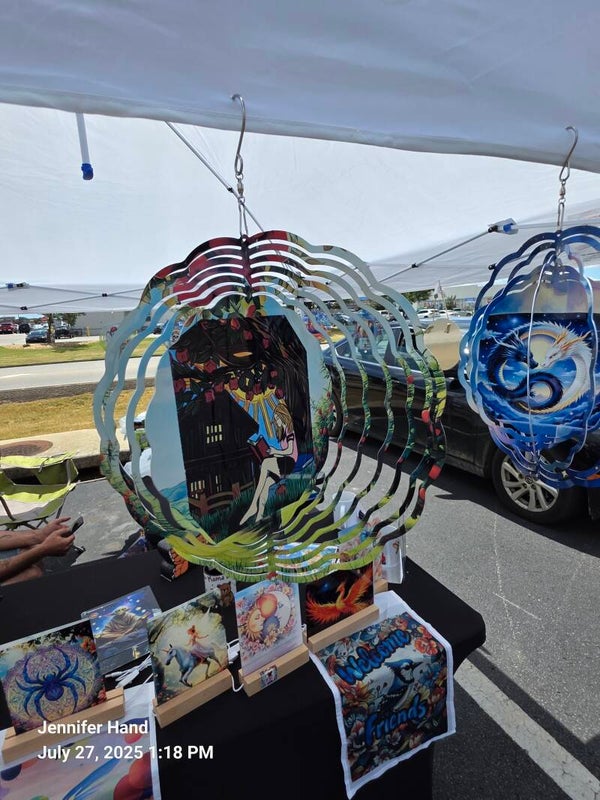 Original hand drawn art reminiscent of childhood pressed on a weatherproof metal wind spinner perfect for in or outdoor spaces. Available in 8 or 10 inch