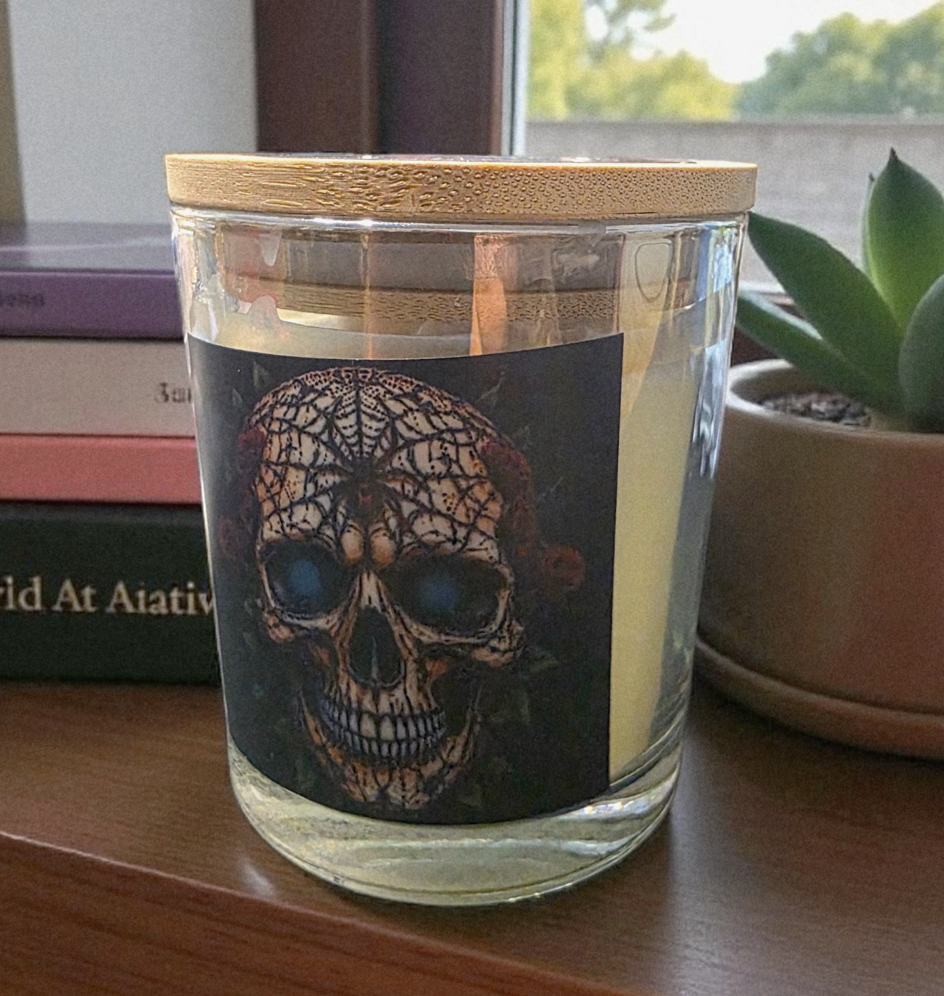 This 12 oz soy wax candle in Dragon's Blood scent is handpoured into a custom Skull Jar perfect for any candle lover who is into skulls Great for gifting or aromatherapy & grounding. The jar is also reusable as decorative accent or a clutter catcher. The lid is bamboo