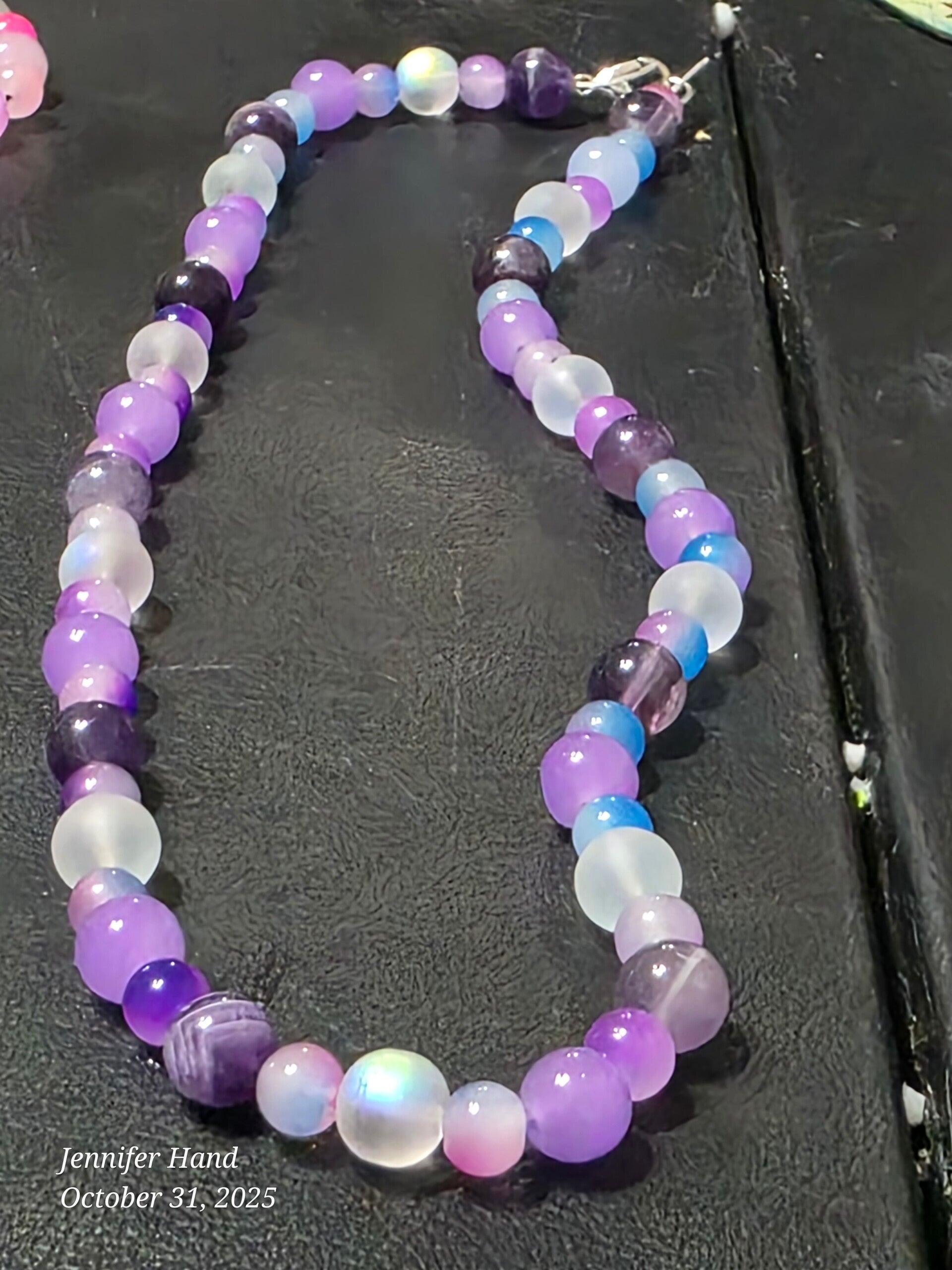 Embrace the serene magic of the twilight sky with this stunning 19-inch handmade necklace. This piece beautifully merges deep purples with soft, iridescent tones, making it an exquisite accessory and a perfect gift idea for someone special.