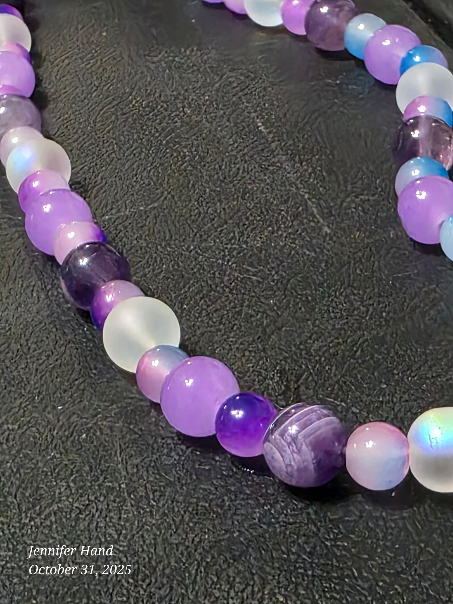 Glass Accents: Subtle blue and lavender glass beads enhance the color transition and add a polished sheen to the design.