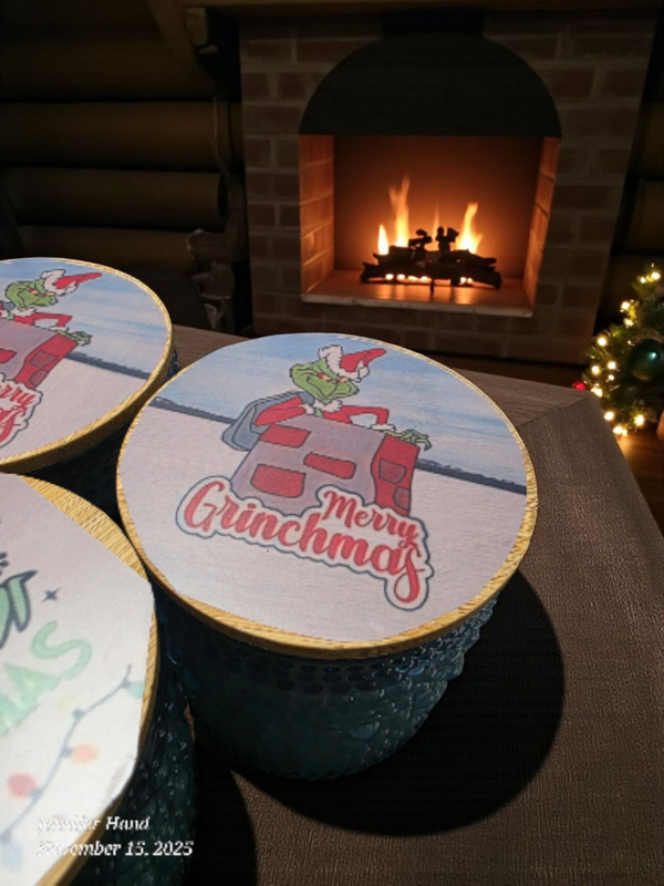 The candle is housed in a beautiful, soothing sapphire-blue glass jar that evokes a clear winter sky. The finishing touch is the elegant, eco-friendly bamboo lid, which features a high-quality, full-color image of the mischievous Grinch and his loyal dog Max (or Mary Grinchmas) celebrating the season. It seals in the fragrance and turns the candle into a charming decorative piece even when unlit.