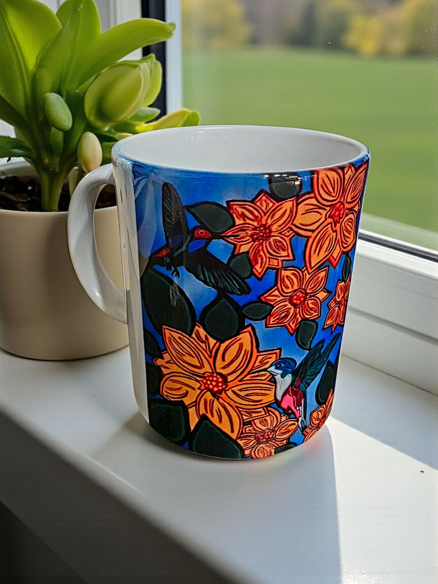 Start your morning with a splash of nature! This stunning 11 oz ceramic mug features original, hand-drawn artwork that brings the beauty of the garden right to your coffee table. The design showcases lively hummingbirds flitting among bright orange blooms against a deep, rich blue background, creating a bold and colorful statement piece.
