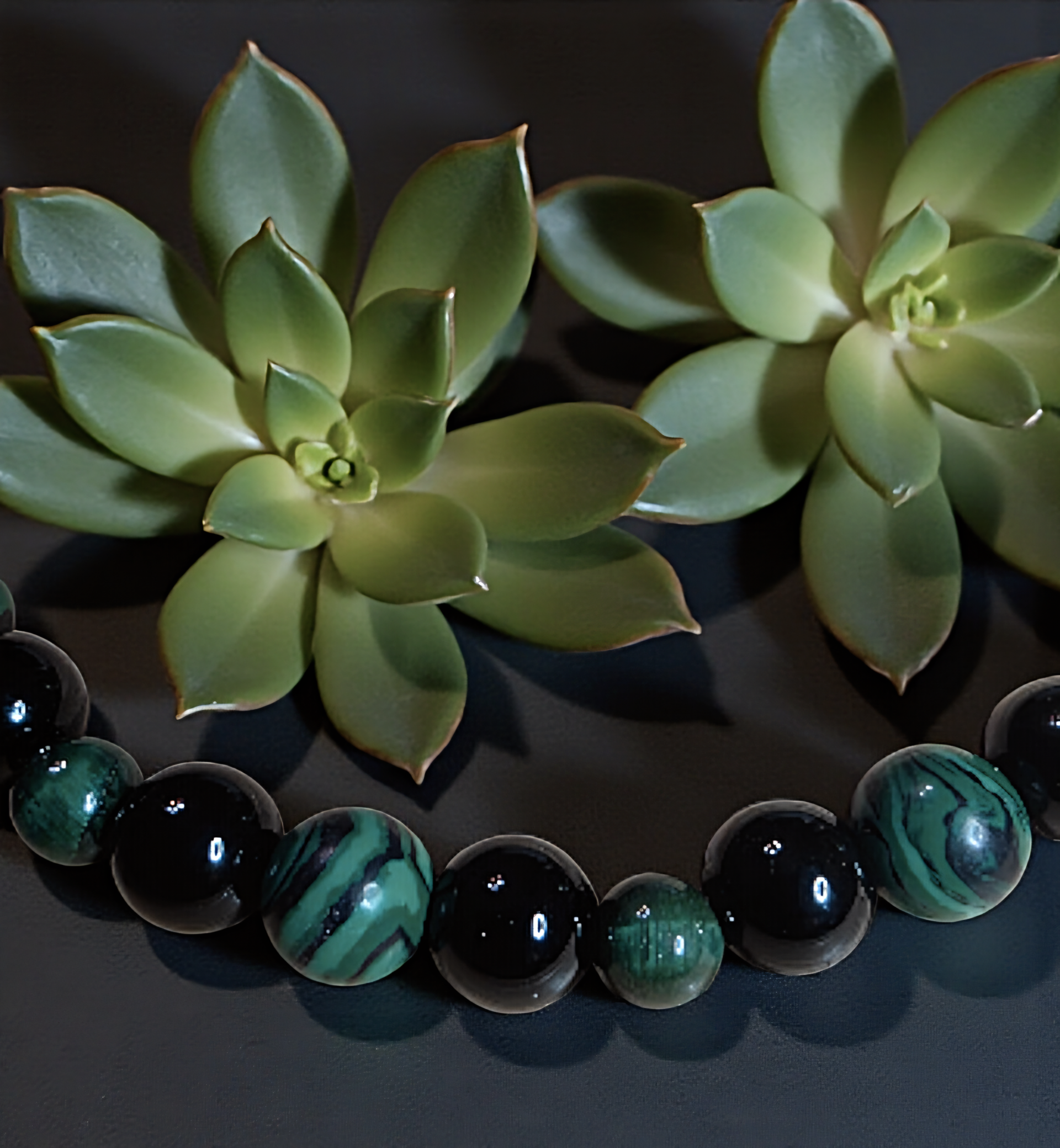 Powerful Gemstones: Features lustrous black Obsidian, known for its protective energy, and banded green Malachite, often associated with transformation and personal growth.