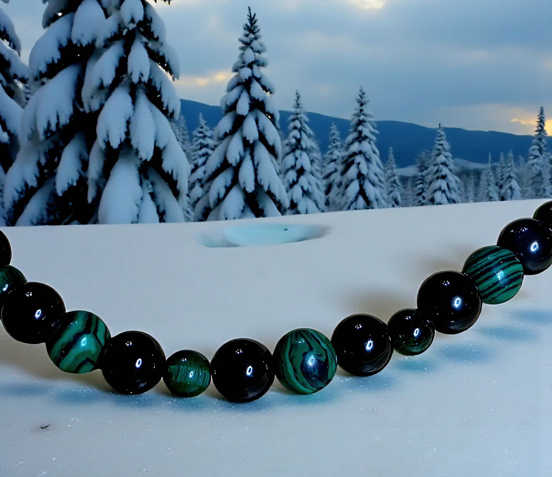 Unveil your inner strength and sophistication with this striking 23-inch beaded necklace. Handcrafted with genuine Malachite and polished Obsidian beads, this piece is a fusion of deep, protective black and vibrant, swirling green.