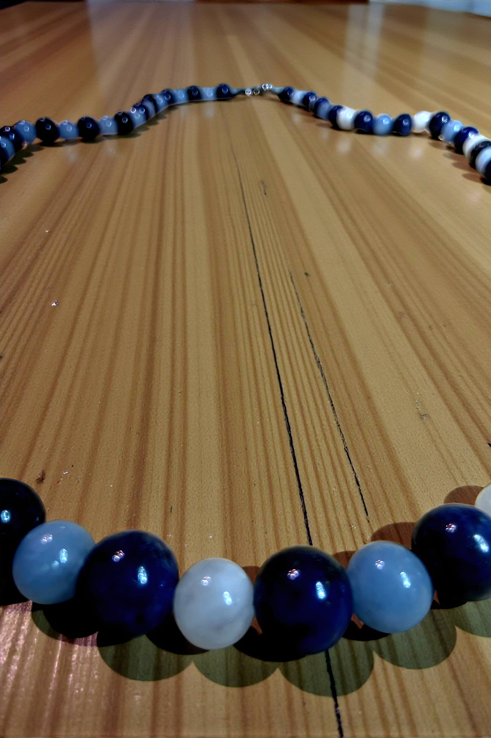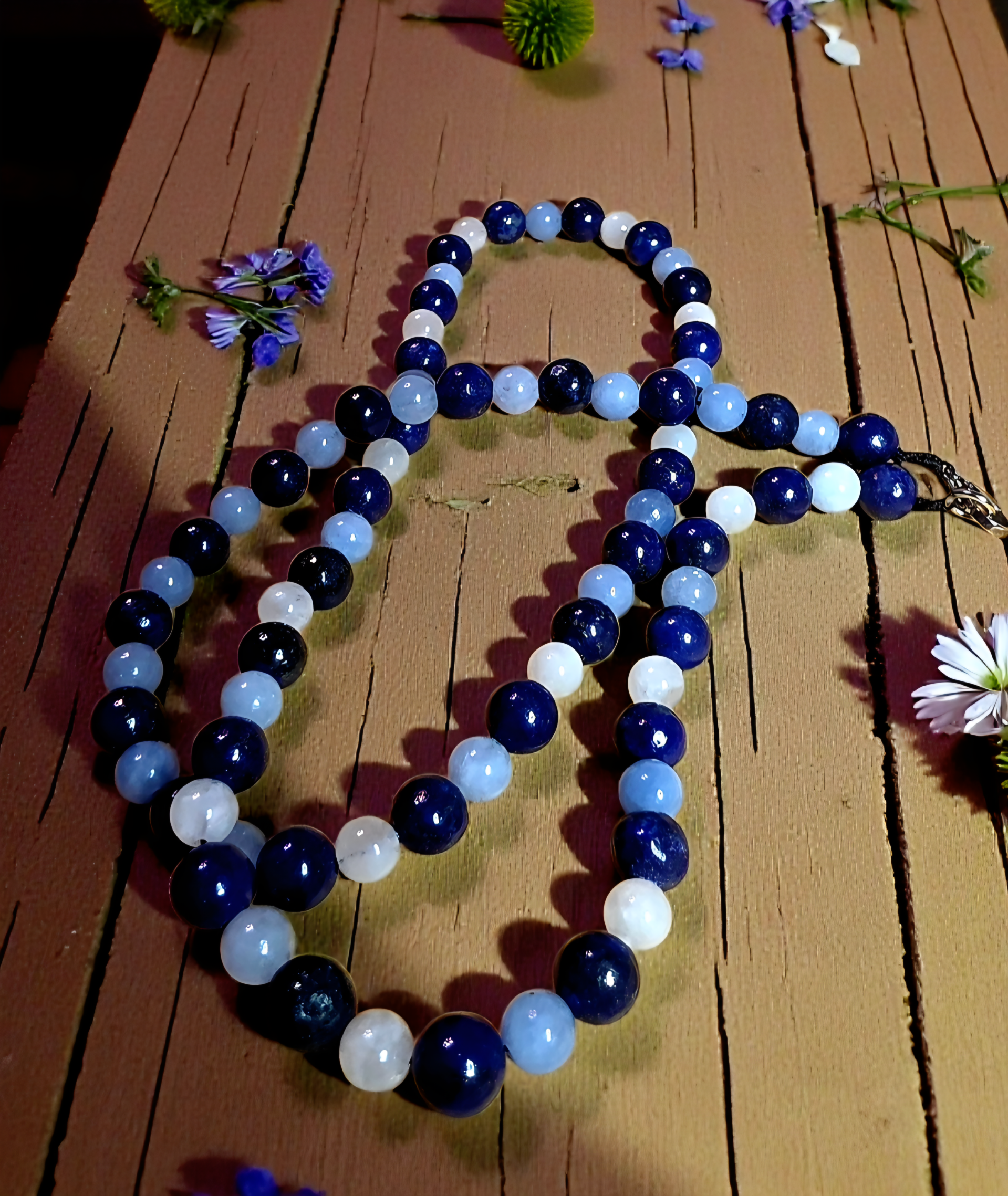 Genuine Lapis Lazuli: The necklace is anchored by richly colored Lapis Lazuli beads, famous for their intense blue hue and subtle, natural gold flecks (pyrite) that resemble a starlit night sky.