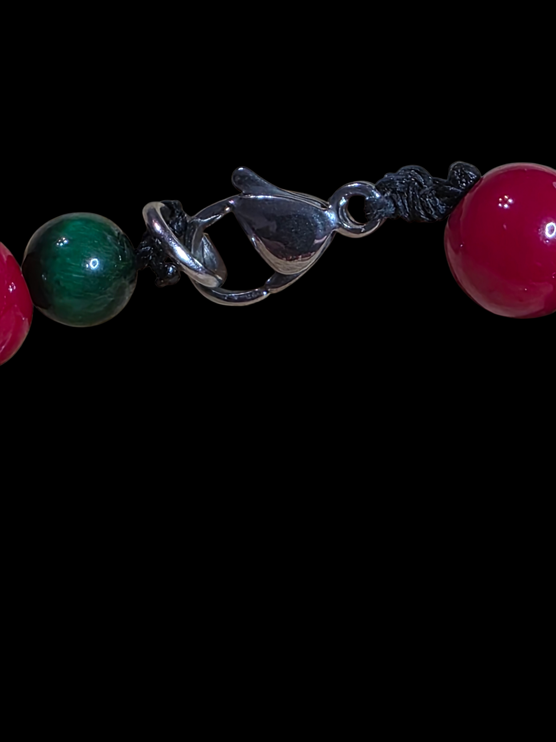 Celebrate the season in style with this festive and fun Red, White, and Green Gemstone Bracelet. Featuring a striking combination of polished Dior Red Agate, White Agate, and deep Green Tiger Eye, this piece captures the classic holiday color palette with the elegance of natural stone.