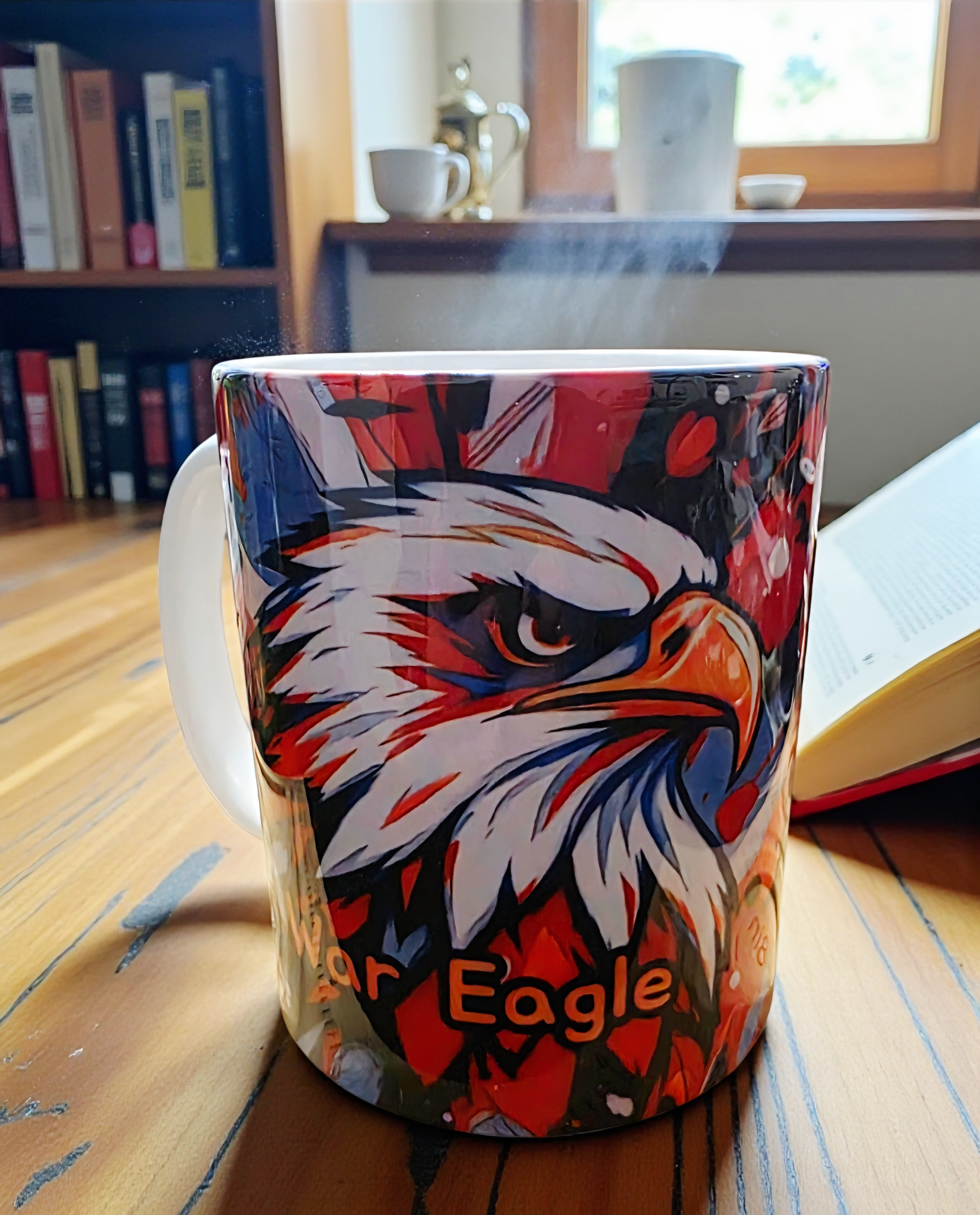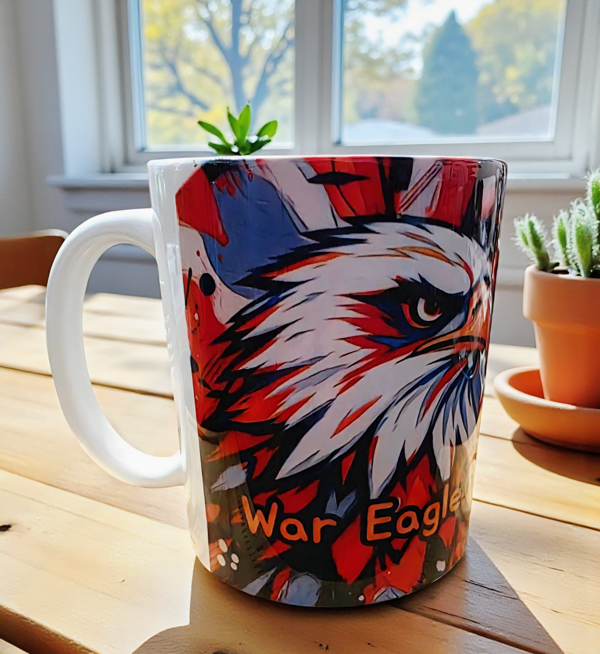 Show your unwavering Auburn spirit with this all-custom, high-impact ceramic mug! Featuring a fierce, vibrantly colored bald eagle illustration in striking orange, white, and blue, and the iconic phrase "War Eagle" proudly displayed, this mug is a must-have for any Tigers fan.